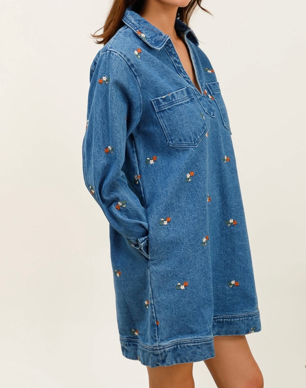 Robe courte en denim à la coupe droite et décontractée. Elle présente un col chemise, une patte de boutonnage partielle à l’avant et deux poches poitrine plaquées. De petites broderies fleuries parsèment l’ensemble du modèle, apportant une note fraîche et féminine.